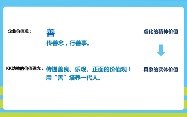 第二層實業(yè)文化(KK產品、KK幼教、KK魔法學堂等),分別表現(xiàn)“寓教于樂、探索體驗、安全專業(yè)、互動親和”等更具象的品牌研發(fā)宗旨和體驗感受。
