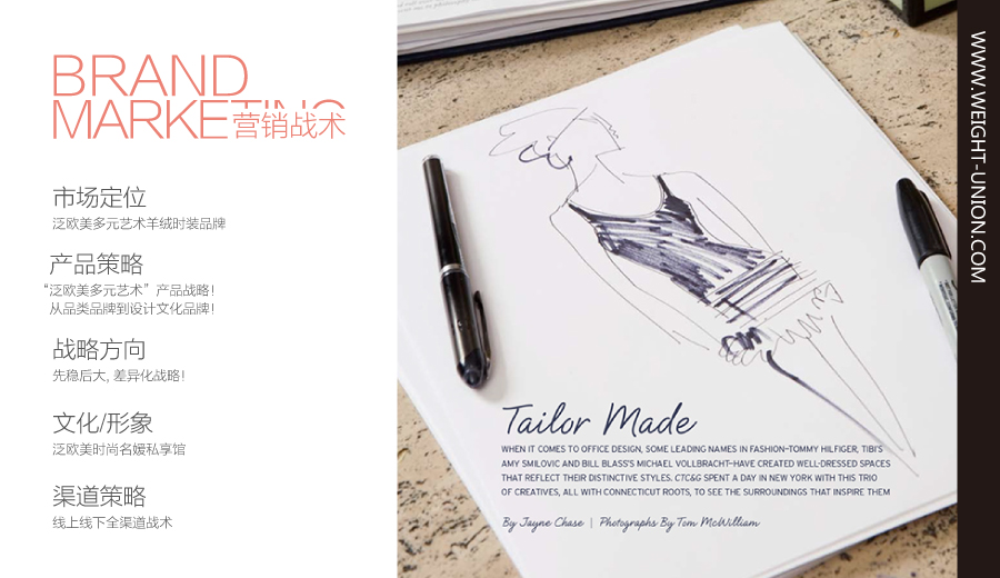 2. 我們提出“泛歐美多元藝術(shù)”的大品牌戰(zhàn)略,從市場(chǎng)定位、戰(zhàn)略方向、產(chǎn)品策略、渠道戰(zhàn)略、文化形象等5個(gè)維度,提升姿艾的時(shí)尚屬性及品牌競(jìng)爭(zhēng)力。